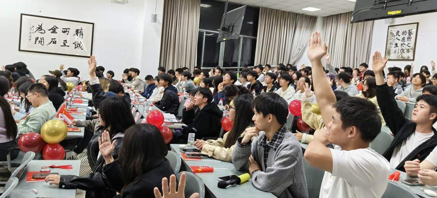 集体宣誓环节,全体同学起立举拳,铿锵誓言响彻会场,字字彰显新时代青年将抗战精神融入青春征程、践行技术报国初心的坚定决心。