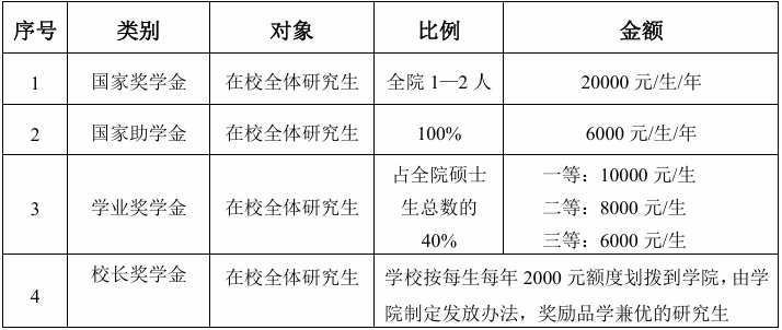 2.研究生在校期间,符合条件者可享受国家助学金、国家助学贷款,以及各类奖学金、“助教、助管、助研、兼职辅导员”兼职岗位。