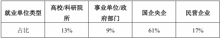近五年,我院研究生就业率均达到100%,其中国企央企、公务员和事业单位属性的机构占比达到80%,就业整体质量较高。就业单位主要为:设计院、研究所、公务员、高校、考取博士、国家电网和其他企事业单位。